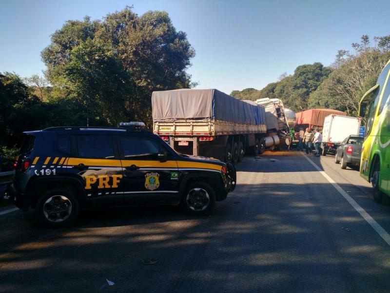 Um acidente entre caminhões e carros deixou mortos e feridos no quilômetro 124 da BR-277, em Balsa Nova, na Região Metropolitana de Curitiba, por volta das 14h desta quinta-feira (25).rnrnSegundo a Polícia Rodoviária Federal (PRF), seis mortes tinham sido confirmadas até as 16h20, e havia o registro de três feridos.rnrnrnAinda conforme a polícia, três caminhões e cinco carros se envolveram na batida, que aconteceu próximo à entrada da empresa Cimento Itambé.rnrnrnDuas mortes foram confirmadas em uma Land Rover Discovery, com placas de Curitiba; mais duas em um VolksWagen Gol, com placas de Francisco Alves; e outras duas em um Ford Escort SW, com placas de Florianópolis e inscrição da Fundação Nacional de Saúde (Funasa).rnrnrnO quarto carro é um Chevrolet Cobalt, com placas de Balneário Camboriú.rnrnrnOs caminhões envolvidos são: um Volvo FH12 380, com placas de Cantagalo; um MB Axor, com placas de Itajaí; e um Volvo FH12 440, com placas de Curitiba.rnrnrnO motorista do caminhão suspeito de causar o acidente foi preso. Ele será encaminhado para a Polícia Civil em Campo Largo, também na Região de Curitiba. Aos policiais rodoviários federais, ele alegou que ficou sem freios.rnrn rnrnrnrnPista interditadarnrnrnrnÀs 16h45, a pista sentido Curitiba estava totalmente interditada, com mais de 15 quilômetros de congestionamento. O trânsito ficou interrompido já na praça de pedágio de São Luiz do Purunã, no quilômetro 135, para evitar acidentes. Por volta das 18h, a concessionária liberou o acostamento, para que os carros pudessem passar.rnrnrn”No momento do acidente, vi a fila parando e consegui desviar. Estacionei o caminhão e voltei ver. Os bombeiros estavam começando a isolar o local porque havia risco de explosão por um material inflamável em uma das carretas”, conta o caminhoneiro Fernando Paewlak.rnrnrnObras na pistarnrnrnrnSegundo a concessionária que administra o trecho, a CCR Rodonorte, obras estavam sendo feitas no quilômetro 123 desde a quarta-feira (24). Segundo a empresa, o asfalto está sendo trocado e a previsão de término é em 120 dias.rnrnrnO acidente aconteceu próximo às obras, que estavam devidamente sinalizadas, de acordo com a polícia.rnrnrnA polícia ainda não sabe as causas do acidente, mas afirma que o trânsito estava lento no momento da batida.rnrnrn
